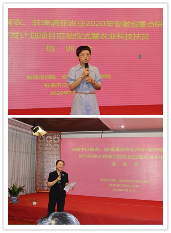 市妇联副主席蒋纹,华体会官方网站_乐华体会(中国)股份有限公司,农学院院长詹秋文,市科技局农村与社会发展科技科副科长李帆,蚌埠市江淮创业大学、安徽中以智农众创空间有限公司董事长方雯,蚌埠清菲农业科技有限公司董事长翟明安,怀远、固镇、五河三县15个扶贫村村干部及村民代表出席会议。