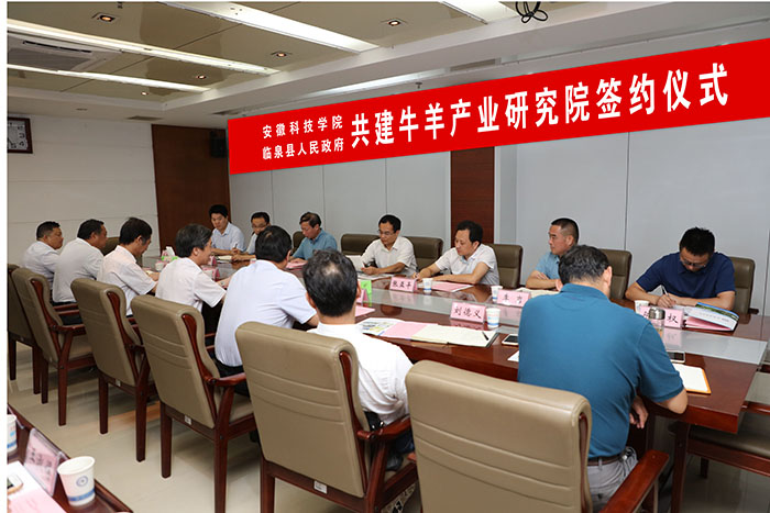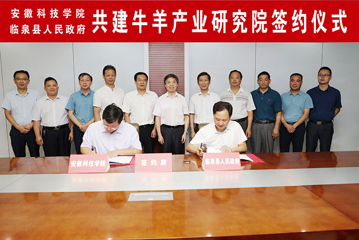 7月29日下午,我校与临泉县人民政府共建牛羊产业研究院签约仪式在校图书馆十楼会议室举行。校党委书记蒋德勤,党委副书记、校长李震,党委委员、副校长李升和,阜阳市委常委、临泉县委书记邓真晓,县委常委、副县长张亚平,校科研处处长、动物科学学院党政领导、省牛羊产业体系首席专家、临泉县有关部门负责同志等出席仪式。签约仪式由李震主持。