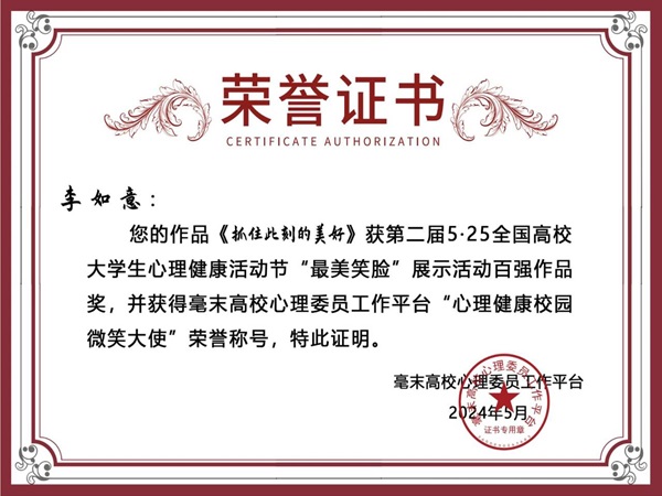 此前,由全国高校心理委员工作平台与壹心理共同举办的第二届5·25全国高校大学生心理健康活动节“最美笑脸”展示评选中,我校荣获“优秀组织奖”,李如意的作品《抓住此刻的美好》荣获5·25“最美笑脸”活动展示全国百强作品,同时获评“心理健康校园微笑大使”荣誉称号。
