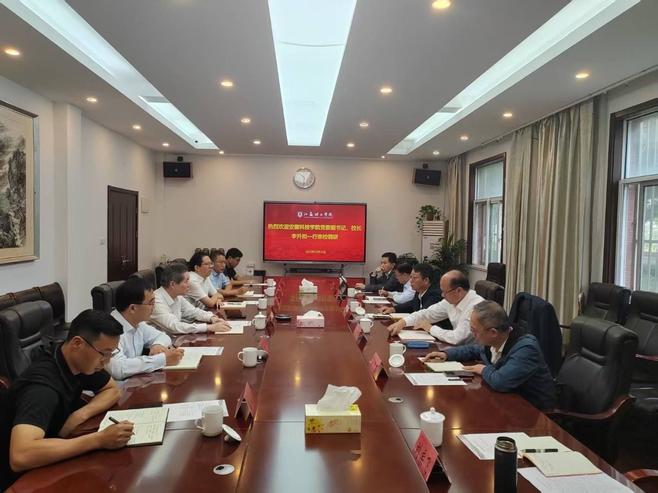 10月15日,党委副书记、院长李升和,党委委员、副院长王孝义率党委(院长)办公室、发展规划处、教务处、科研处一行到江苏理工学院考察交流。江苏理工学院党委副书记、院长戴国洪,党委常委、副院长王俊热情接待李升和一行,并出席座谈交流活动。