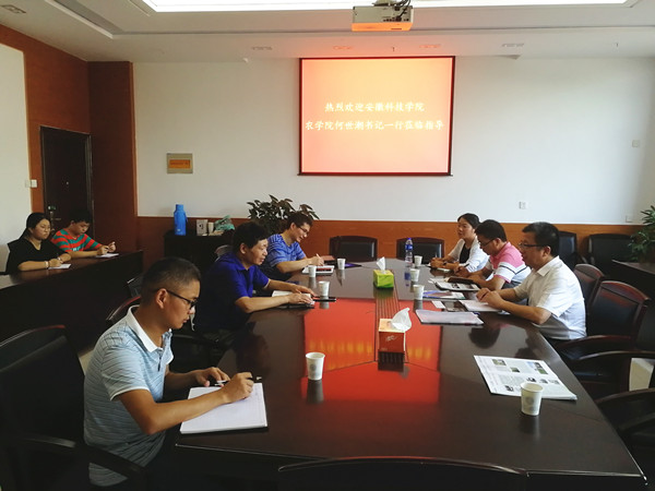 8月19日上午,农学院党总支书记何世潮,党总支秘书、就业联系人张轶辉,植物保护教研室王增霞博士及专职辅导员汪道兵一行四人来到安徽省农业科学研究院水稻研究所,看望正在科研实习学生叶琴、姚文豪等,并举行座谈交流会。