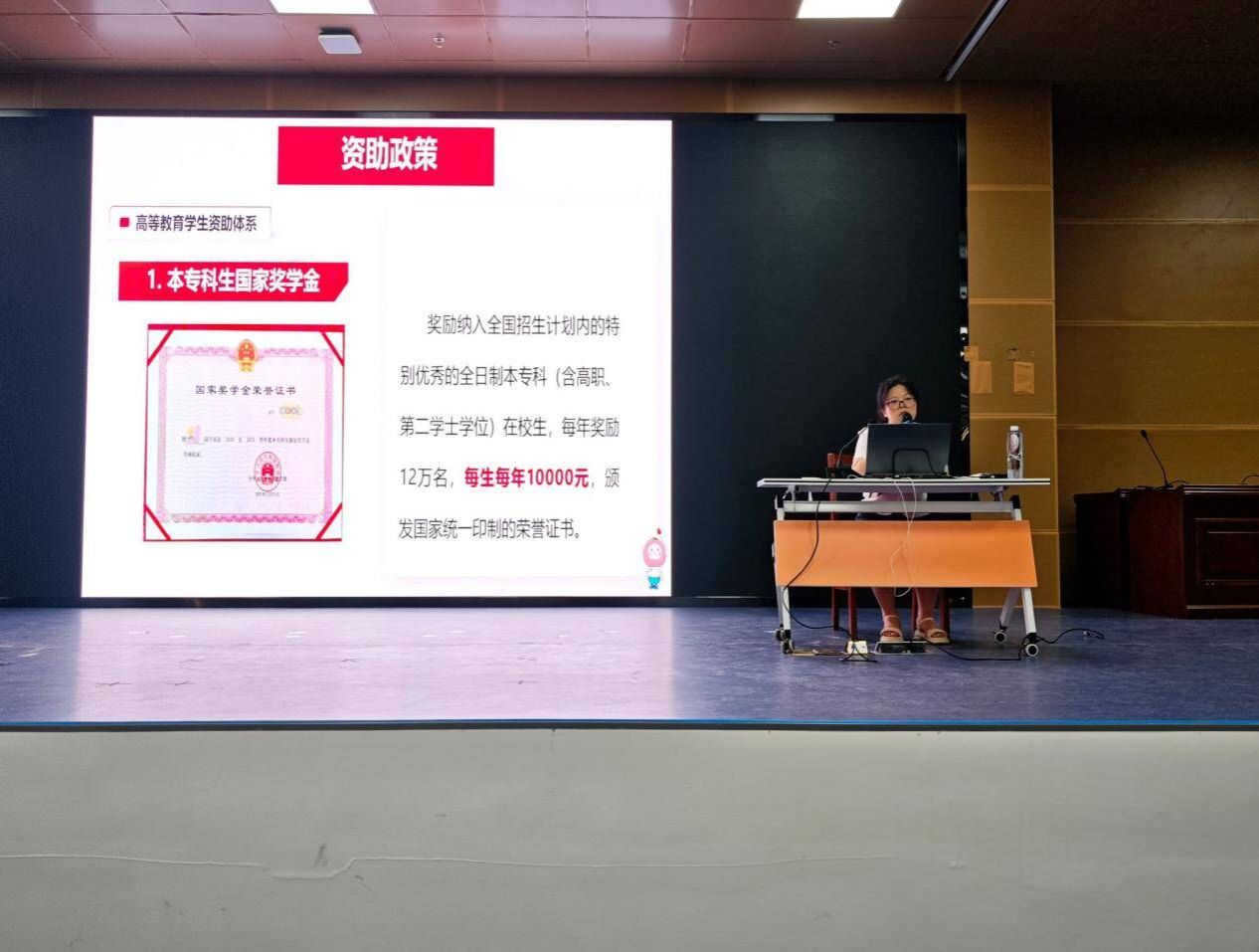 鲁冰冰首先以“三个全覆盖”为主线,清晰阐释了我国高等教育资助政策的普惠性特征——覆盖全部学段、全部学校、所有家庭经济困难学生,让在场同学直观感受了国家资助体系的全面性与保障性。随后,她深入解读了“奖、助、贷、免、勤、补、减”七位一体资助体系:通过国家助学金、生源地信用助学贷款等精准发力,强化经济困难学生就读大学的基础保障;以国家奖学金、国家励志奖学金为激励导向,点燃学业奋进热情;同时依托基层就业资助、服兵役学费补偿等政策,引导学生将个人发展与国家需求相结合。鲁冰冰特别强调,这一资助体系兼具“保障兜底”与“激励成长”双重属性,既着力解决学生的实际经济压力,更注重通过政策引导助力学生全面发展、成长成才。