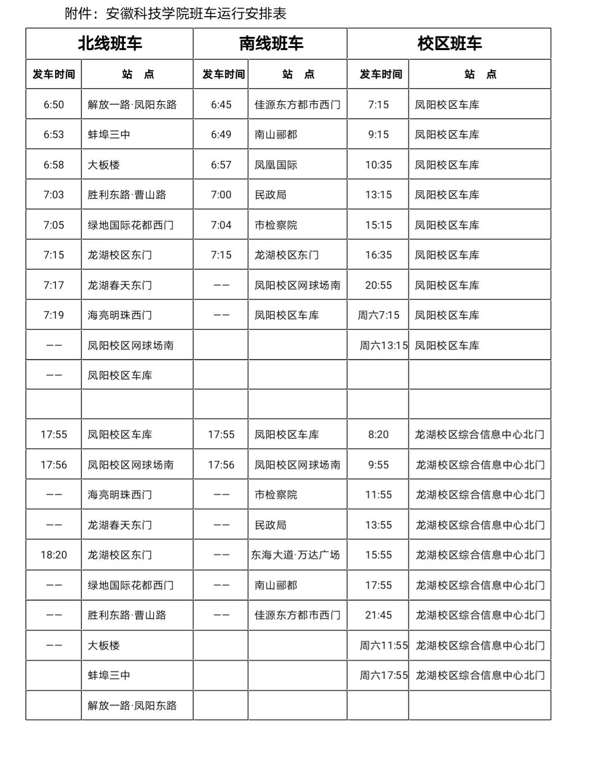 一、8月23—29日,南、北线班车各站点按《班车运行安排表》早上推迟15分钟发车,晚上提前15分钟发车;校区班车运行时间为:凤阳校区车库7:30、13:30,龙湖校区综合信息中心北门12:10、17:40。