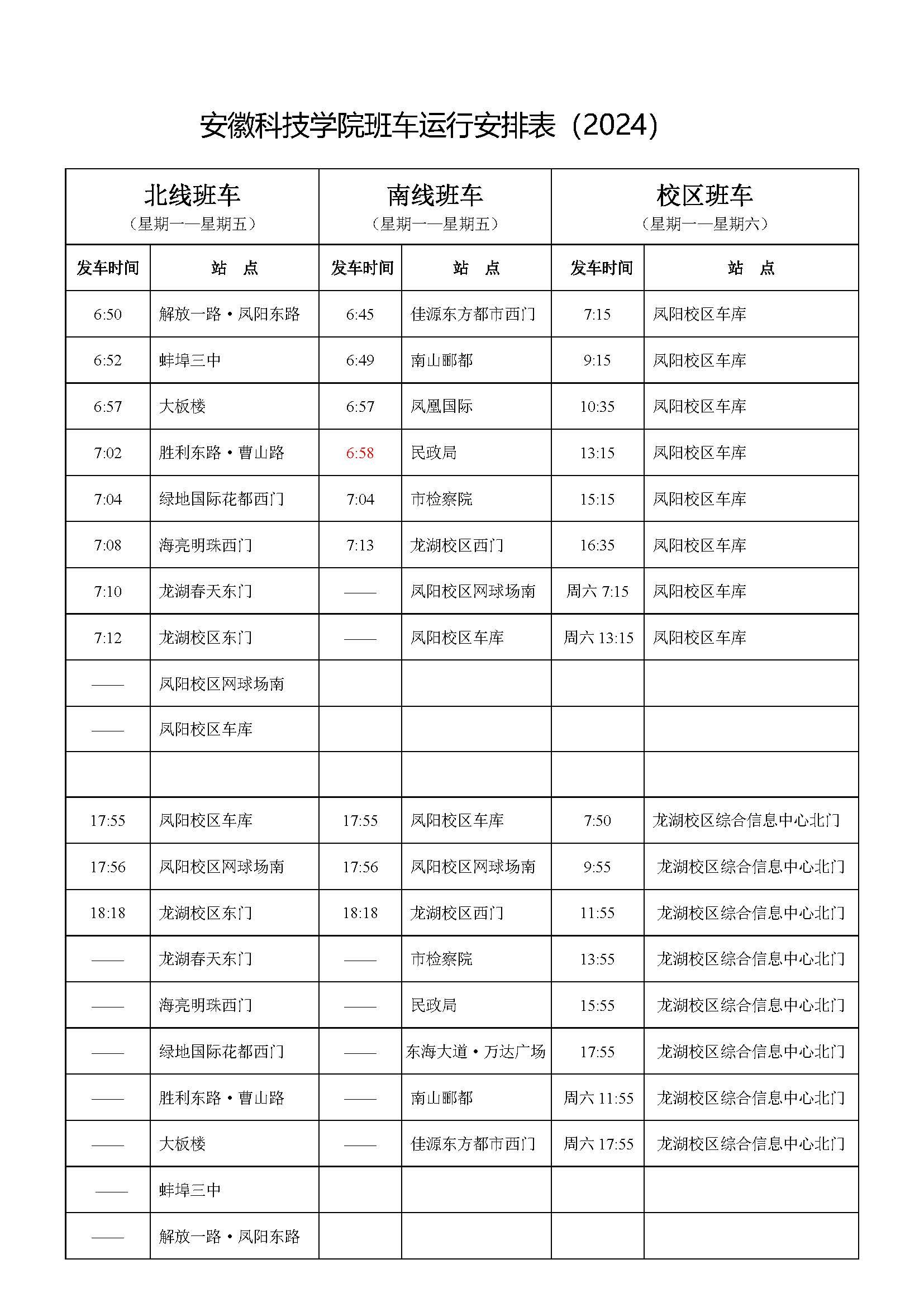 1.南、北线班车各站点按《班车运行安排表(2024)》早上推迟15分钟发车,晚上提前10分钟发车。